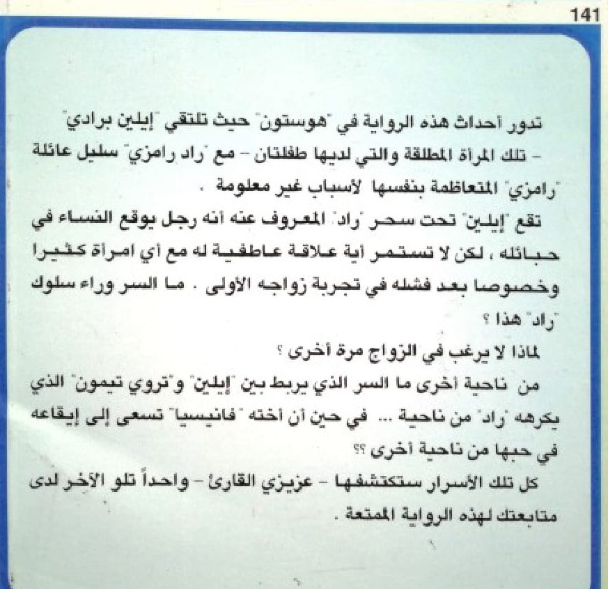 تعتبر واحدة من أجمل سلسلة الروايات القصيرة الرومانسية منذ عقود، فهي مجموعة من الروايات الرومانسية العالمية المنتقاة بعناية شديدة والتي تزخر بحمولة عاطفية عالية وتلتهب خلالها المشاعر المتناقضة مثل الحب والكراهية والغضب والحلم والمغفرة والانتقام، كل ذلك بأسلوب شيق وممتع يرحل بالقارئ إلى عوالم الحس والشعور والعاطفة، في بحر به في أعماق المشاعر الإنسانية المقدسة والراقية التي عرفها الإنسان في مختلف العصور والأزمان.